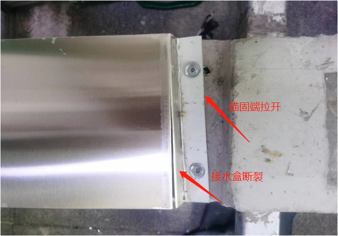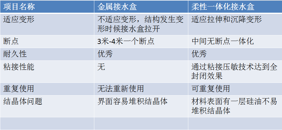 目前设计的变形缝接水盒多为金属材质,金属材质的优势是耐久使用寿命长,缺点是不能伸缩变形,安装后变形缝发生沉降和拉伸时,导致接水盒拉开漏水甚至会导致脱落。不锈钢接水盒在生产过程中受材料和运输影响不能加工成连续的,大概每根长度3米或4米。在安装后会产生搭接,通过我们在现场观察大多数接水盒渗漏水都是搭接部位和两侧变形后封闭不到位漏水,从而失去接水盒的意义。